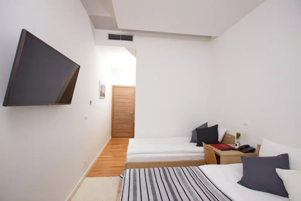Opremljena je flat SMART TV-om sa satelitskim prijemnikom, telefonom sa direktnom linijom te minibarom za osvježenje nakon dugog putovanja. Daljinski upravljane rolete na prozorima omogućuju potpuno zamračenje prostorije.